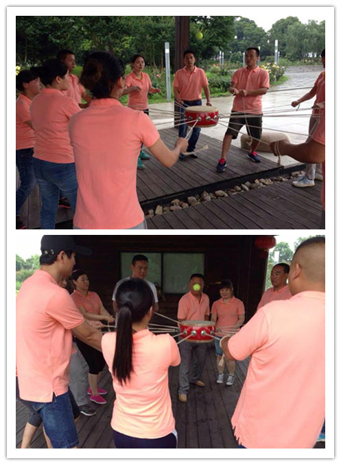 鼓動(dòng)人心,同一小組的學(xué)員以一面鼓為圓心圍圈站好。鼓身周圍有長(zhǎng)繩,鼓面上放一排球,全隊(duì)成員每人拽住一根繩子保持鼓面平衡,必須手握繩套部位,要求在鼓不落地,球不能落地的情況下將球在鼓面上顛50次。